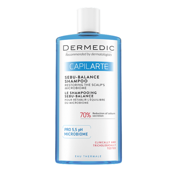 CAPILARTE Шампонот за нормализирање на масна коса со тенденција за опаѓање, исто така се препорачува и за себореичен дерматитис. Ефективно ја чисти, регулира и смирува активноста на лојните жлезди и видливо го намалува ефектот на мрсна коса. Ги храни фоликулите на косата, ја зајакнува косата и спречува прекумерно опаѓање. Ја враќа рамнотежата на епидермичниот микробиом.