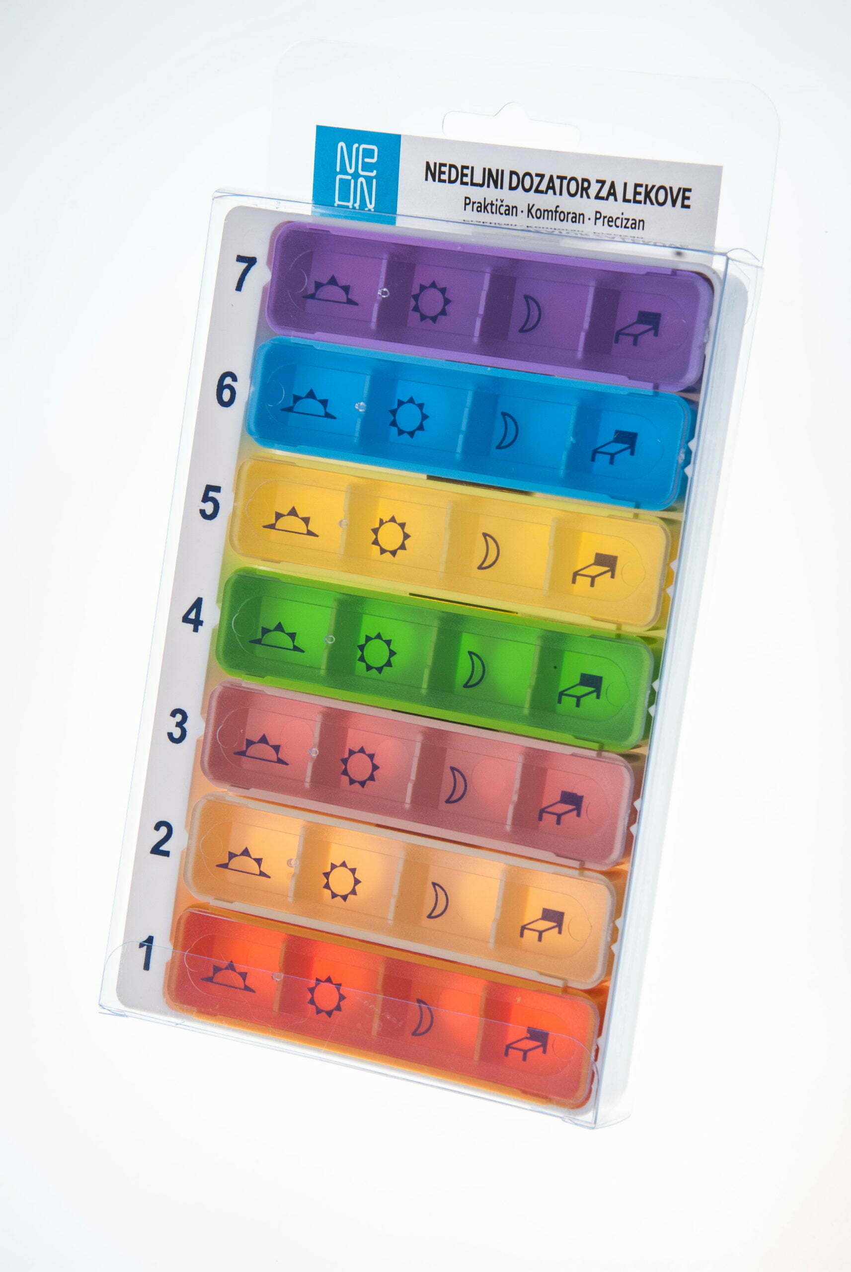 Неон неделниот дозатор за лекови содржи 7 дневни дозатори, со по 4 прегради за чување на лекови со ознака: утро, пладне, вечер или ноќ.