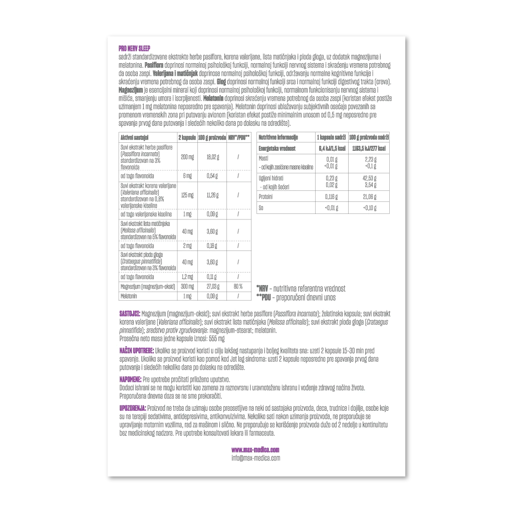 Pro Nerv Sleep содржи стандардизирани екстракти од билка од пасифлора, корен од валеријана, лист од маточина и овошје од глог, со додавање на магнезиум и мелатонин. Синергично, овие 6 активни состојки овозможуваат полесен и побрз почеток на сонот и подобрување на неговиот квалитет. Pro Nerv Sleep помага и кај синдромот на Jet Lag, кој е поврзан со промена на временските зони при патување со авион.