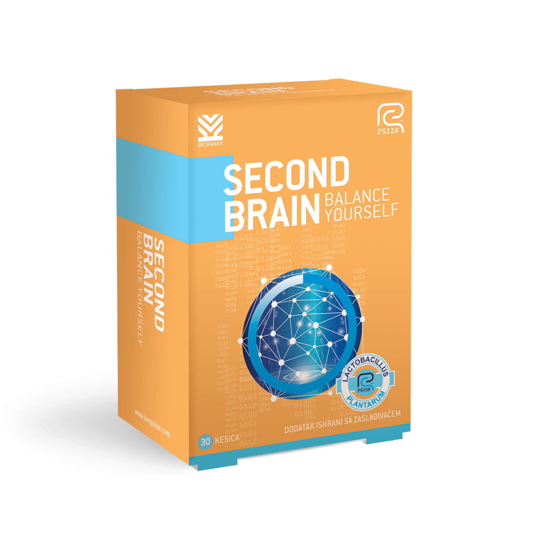 Second Brain е иновативен и револуционерен ПСИХОБИОТИК Lactobacillus planarum PS128 TM, за кој со бројни студии е докажано дека го балансира допаминот и серотонинот и го намалува стресот.