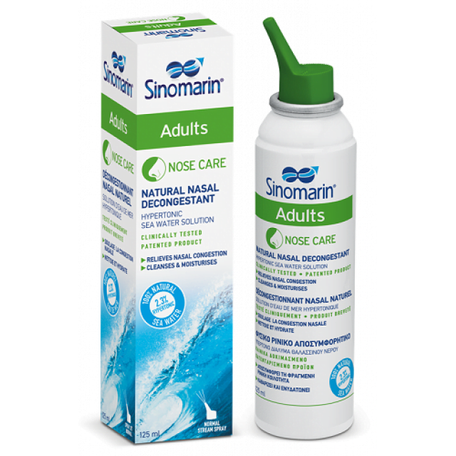 Синомарин спреј за возрасни е клинички докажан назален деконгестив. Тоа е хипертоничен раствор на морска вода (2,3% NaCl), богат со корисни морски состојки (минерални соли и елементи во трагови).