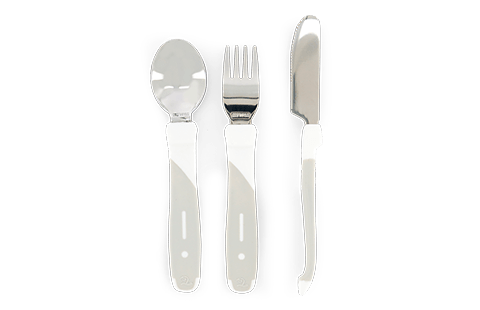 Нож со безбедно сечило за сечење, лажица дизајнирана за големина на залак на мало дете и вилушка со нежни боцки направени од нерѓосувачки челик. Мека површина на допир, нелизгачка рачка со ергономски обликуван дизајн која лежи стабилно во раката на бебето и го поттикнува учењето.